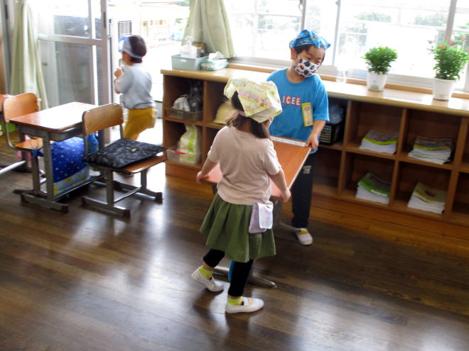 自分の体くらいある机も友達と協力して片付けます。雑巾がけも上手にできています。