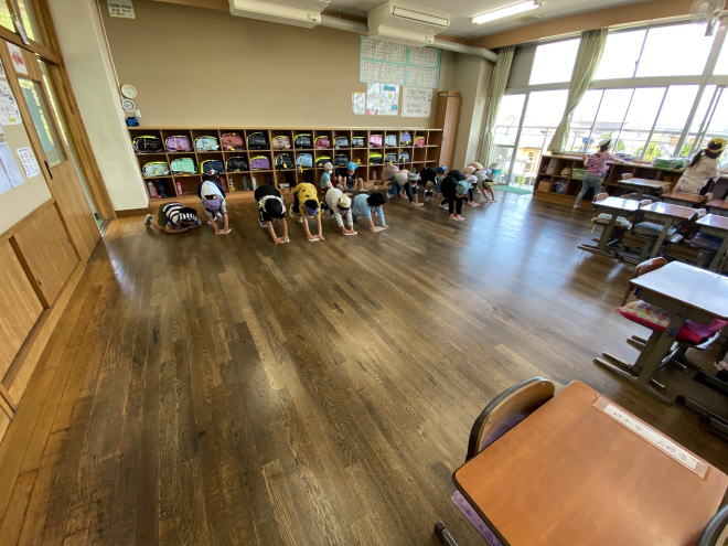 また、速く走ったり、遠くに跳んだりすることも大事ですが、「最後まで一生懸命やる」「あいさつ、返事、準備・片付けを頑張る」「ランドセルを整頓しておく」などの習慣がつくように活動を行っていきます