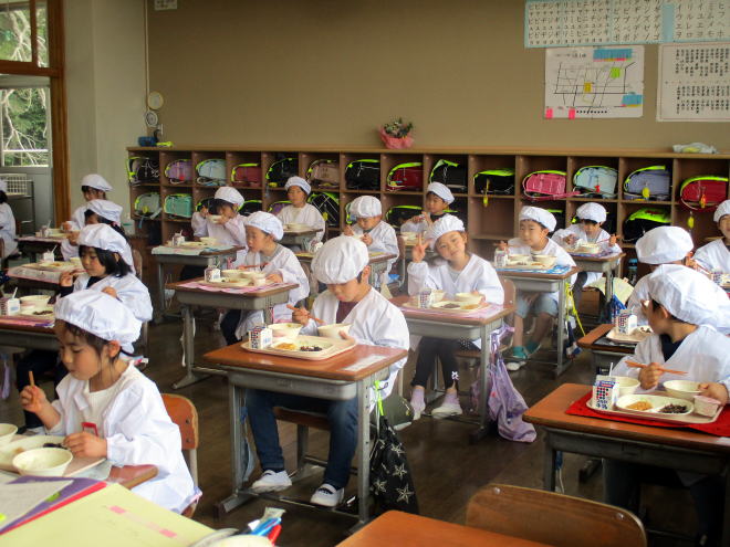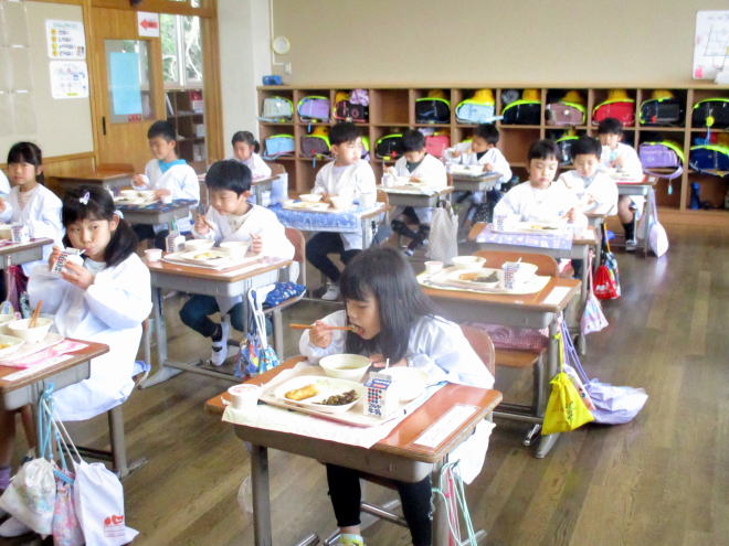 「コロナ禍」ということで対面をしない黙食が続いていますが、美味しそうに給食を食べています。