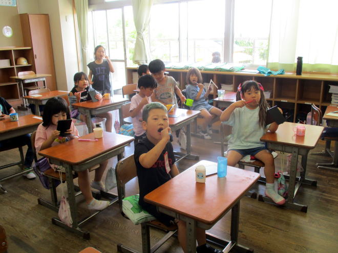 6月11日(火)に養護教諭が1年生に歯磨き指導を行いました。